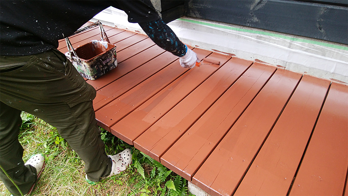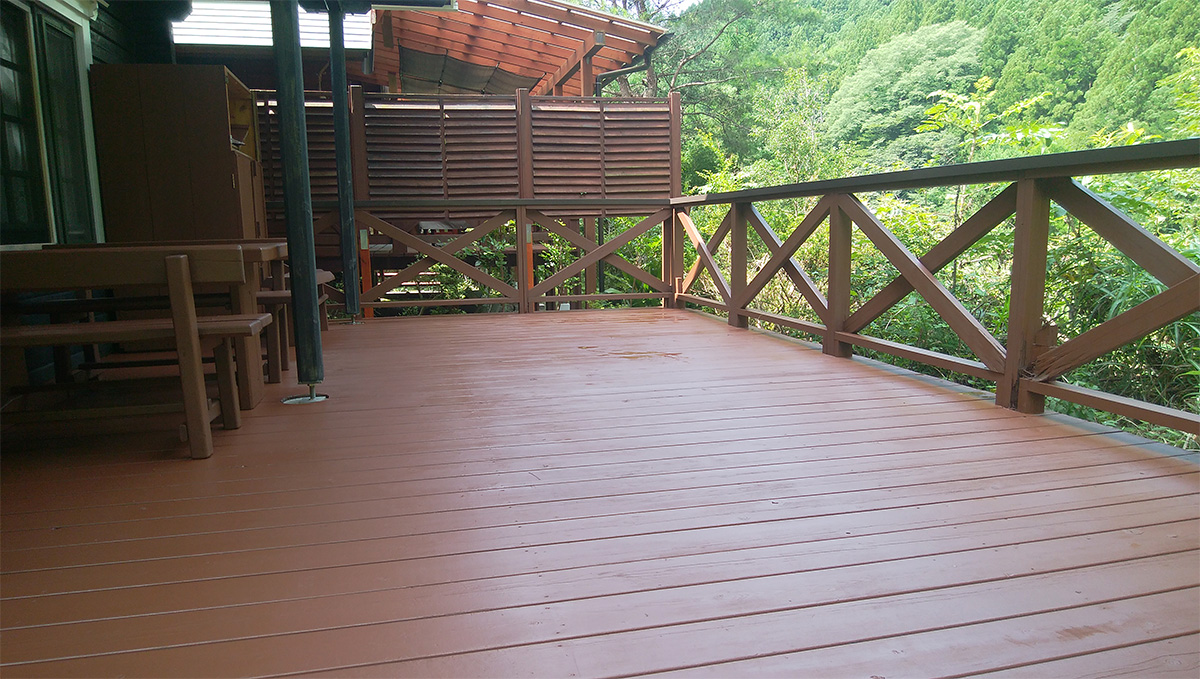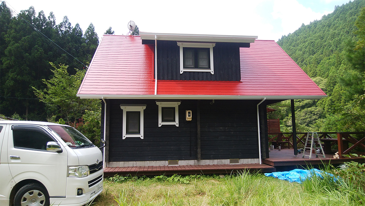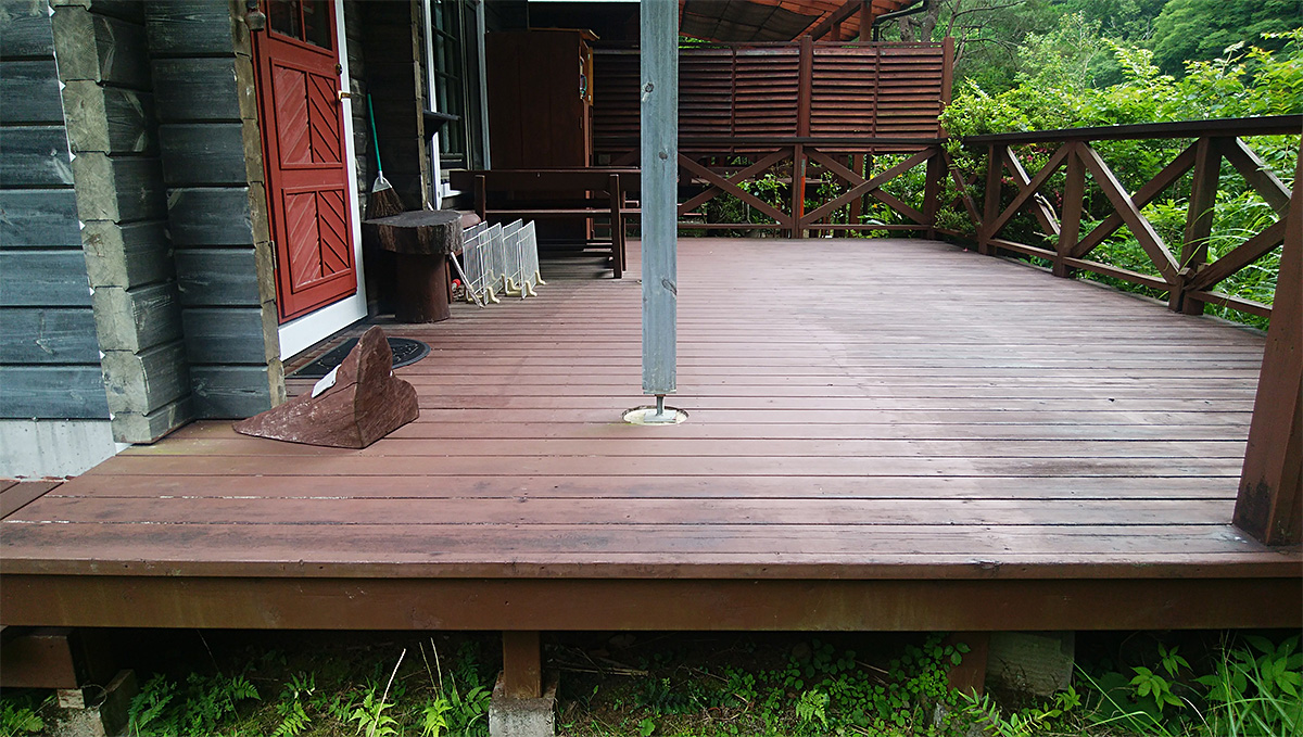 | 施工内容 | ・カラーベスト屋根の塗装タスペーサー設置 ・屋根の破損、クラックの補修 ・キシラデコール、ガードラックによる木部の塗装 ・ウッドデッキの塗装 ・横樋鼻隠しの破損の補修軒天の汚れカビ ・現場まで片道2時間 |