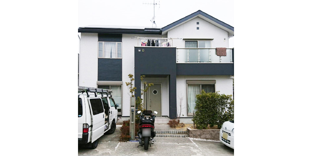 | 施工内容 | ・カラーベスト屋根の塗装、サイディング外壁の塗装、シーリング工事 ・サイディング目地、軒取り合い、サッシ廻りのシーリング工事 ・FRP防水 ・屋根にタスペーサー設置 ・サイディングの補修 ・サイディングの破損、クラック、チョーキング等の劣化 ・サイディングツートンカラー |